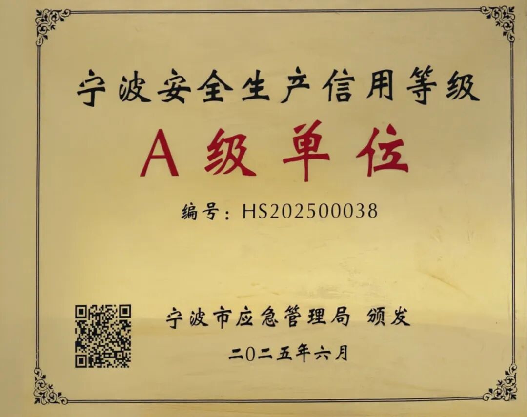 成功斬獲“寧波市安全生產(chǎn)信用等級A級”榮譽,這是寧波市對市場主體安全生產(chǎn)綜合能力的最高級別認可。
